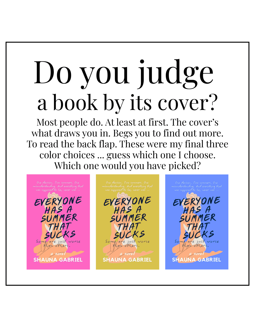 Anyhoo … I opted to keep it simple but found myself vacillating on the background color. Ultimately, I went with a brighter version of millennial pink (and yes, it’s a real thing—Google it). But I am curious. What would you have chosen? Image and fonts aside (because that’s a discussion for another post), what color scheme appeals more to you?